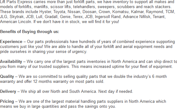 All our lift truck parts are obtainable at the best prices. Call today to get an estimate on one of the parts or attachments we offer. Call us at:
